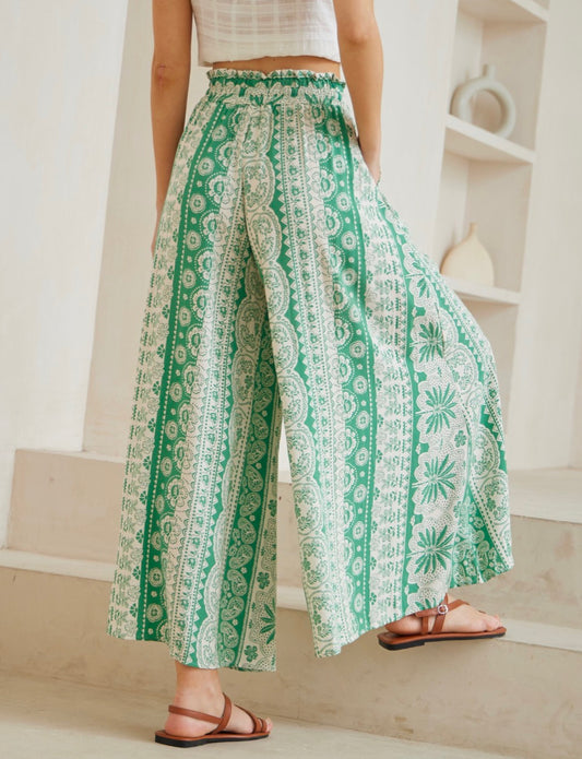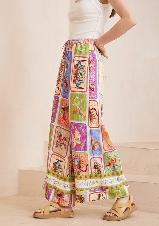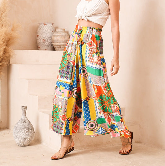 Tropical Palazzo Tan/Pink/Green Block Print Pants